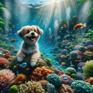 «Imagine a mesmerizing scene featuring a little cute dog fully su...»