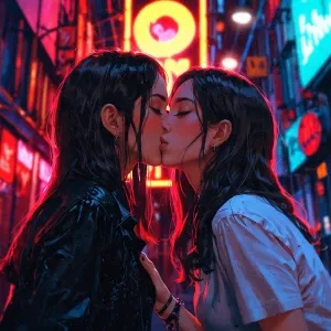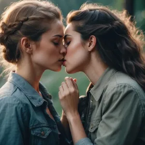 «Two women embracing in a sensual and romantic kiss, displaying a...»