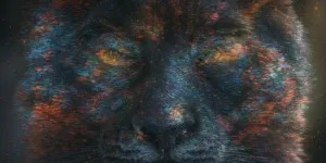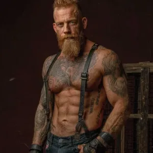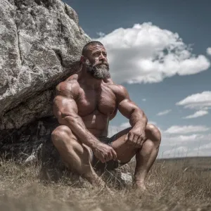 «A close-up portrait of a muscular white man with a beard, sittin...»