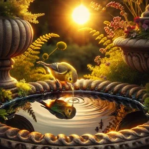 «A small, adorable yellow bird sipping water from a rustic stone...»