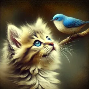 «A cute kitten with a small smile looking up at the blue bird who...»