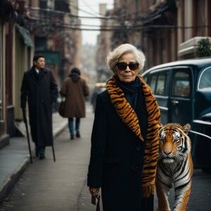 «An elderly woman with sunglasses, dressed in a black coat and sc...»