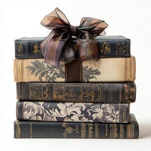 «A neatly stacked pile of ornate, decoratively bound books adorne...»
