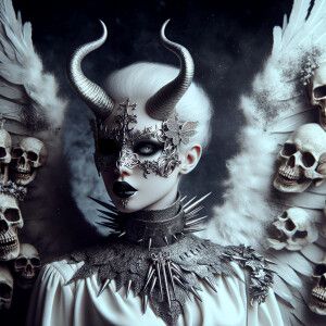 «a dark figure that embodies a mixture of angel and demon. Wearin...»