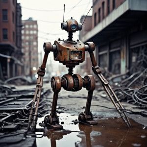 «A decrepit droid mechanic, limbs rusted and wires exposed, stand...»