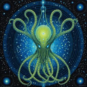 «A luminously glowing tentacled alien deity, its intricate tendri...»
