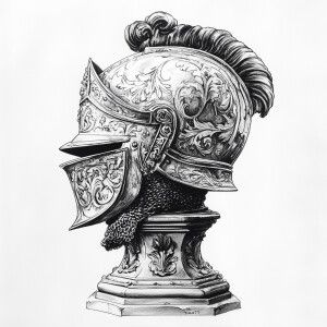 «In a detailed ink style drawing, a knight's helmet sits prominen...»