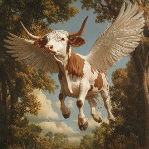«A cow soars through the sky, flapping its enormous wings as it g...»