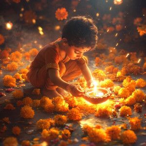 «A boy illuminating a Diya surrounded by marigold flowers and fir...»