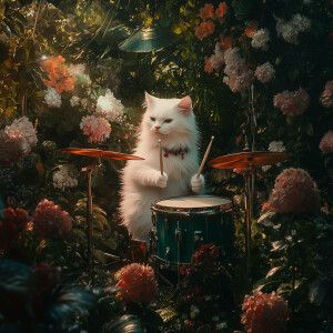 «A white cat playing a drum set appropriately sized for a feline,...»