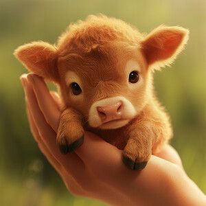 «A tender scene featuring a small, adorable cow, no larger than a...»