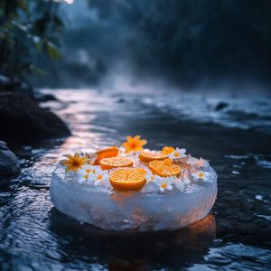 «A stunning ice krathong with frozen citrus slices and fresh flow...»
