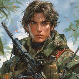 «1 handsome man , anime figure, FPS, holding gun in front of ches...»