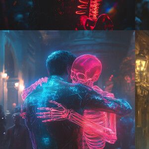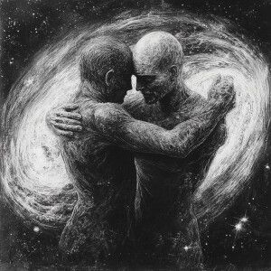 «2 men, hugging in the vast cosmos, surrounded by the infinite ex...»