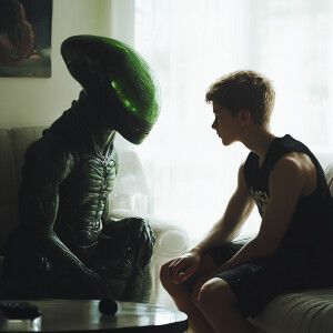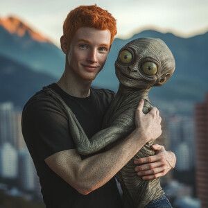 «Capture a hyper-realistic image of a man and an alien in an aff...»