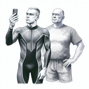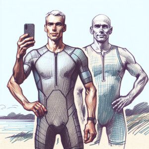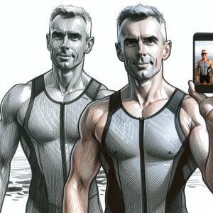 «Idealized posed fit father and son Caucasian triathlete male cou...»