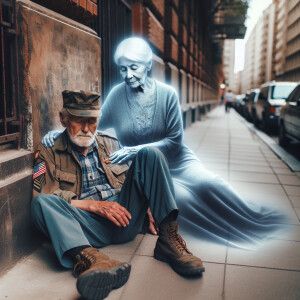 «beautifully weathered old homeless veteran sitting on the ground...»