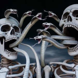 «Snakes flying out the mouth of skeletons»