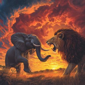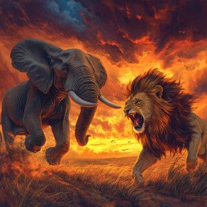 «Foreground: An elephant with flared ears and a raised trunk alon...»