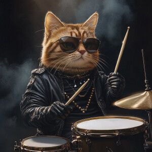 «A cat wearing sunglasses and a black jacket is playing a drum ki...»