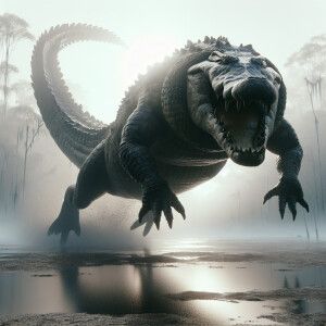 «a ulta-realistic portrait of a jumping huge crocodile, lunging t...»
