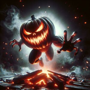 «a hyper-realistic portrait of a jumping evil pumpkin, lunging to...»