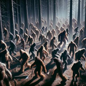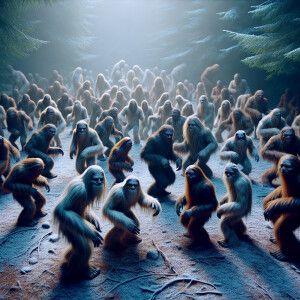 «A gathering of 1,300 humanoid Sasquatches covered in hair, engag...»