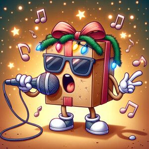 «A Christmas gift box with sunglasses, holding a microphone and r...»