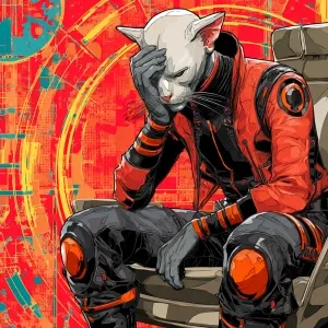 «A humanoid cat character with a bald head, wearing a red and bla...»