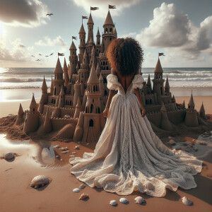 «An Afro Latina woman with long wavy hair flowing in the breeze,...»