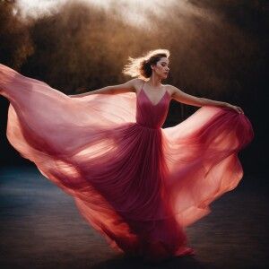 «An elegant woman engaged in a ballet-like dance, wearing a long,...»