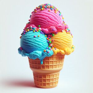 «Create an image of a vibrant, colorful ice cream cone with three...»