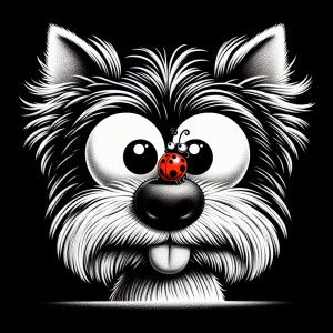 «A whimsical goofy looking black and white yorkie dog with big bu...»