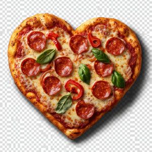 «Create an image of a heart-shaped pizza with golden, crispy crus...»