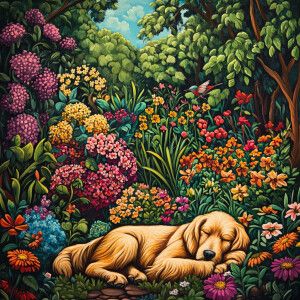 «Depict a dog resting in a garden while a hummingbird flits aroun...»