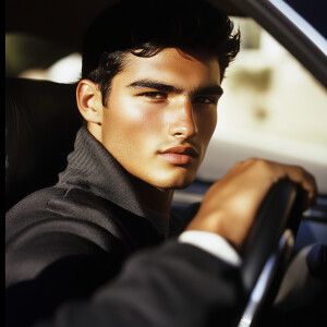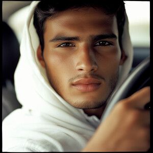 «Close-up from the front shows a young man Arab features driving...»