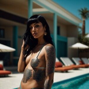«A beautiful woman with colorful tattoos wears a snug two-piece s...»