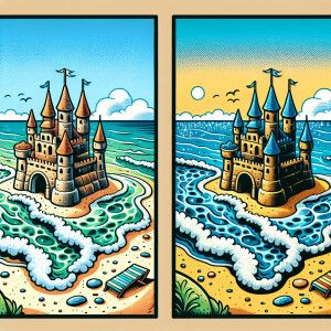 «Cartoon style children's book illustration of a small sand castl...»
