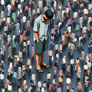 «A jobless man walks alone through the crowd, hands in his pocket...»
