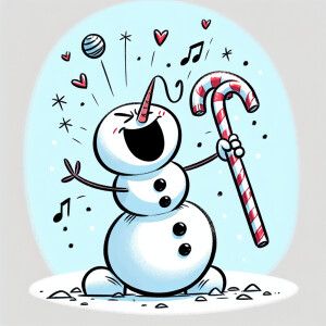 «A snowman holding a candy cane like a microphone, singing joyful...»