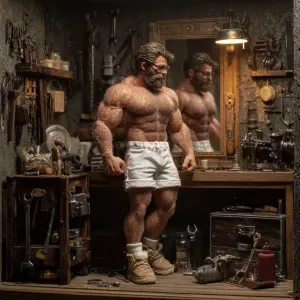 «Generate an image of a muscular and hairy handyman without a shi...»
