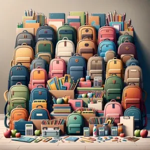 «A line of backpacks against a wall, like the backpacks are linin...»