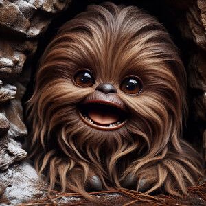 «Closeup portrait of Adorable happy baby Chewbacca in a cave»