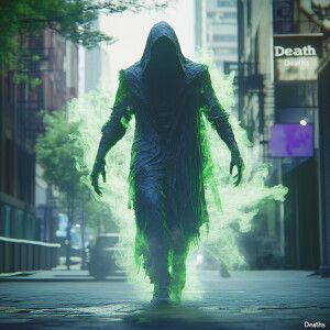 «A hyper-realistic UHD image featuring "Death” wearing a tattered...»