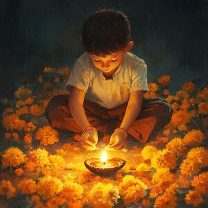 «A boy illuminating a Diya surrounded by marigold flowers and fir...»
