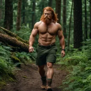 «Generate an image of a rugged, muscular man with a shirtless hai...»