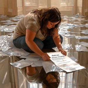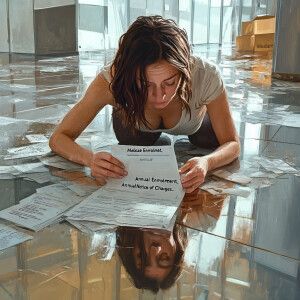«Generate an image of a weary, full-figured woman with brown hair...»