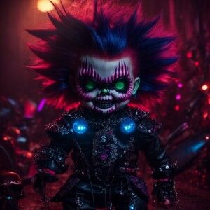 «demonic chucky with half skull face with glow-in-the-dark fangs,...»