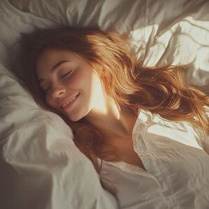 «A woman stretches with a relaxed smile in bed, basked in the sof...»