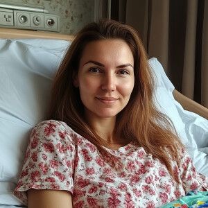 «Женщина лежит в постели. Утренние лучи на постели и ее лице. Она...»